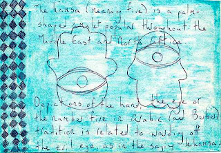 the Hamsa (meaning five) is a palm-shaped amulet popular throughout the Middle East and North Africa.Depictions of the hand, the eye or the number five in Arabic (and Berber) tradition is related to warning off the evil eye as in the saying khamsa fi ainek ("five [fingers] in your eye").